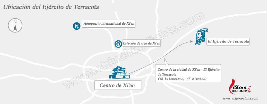 El Ejército de Terracota está a 45 km (28 millas) al este de la ciudad de Xi'an, y demora aproximadamente 1 hora en automóvil.