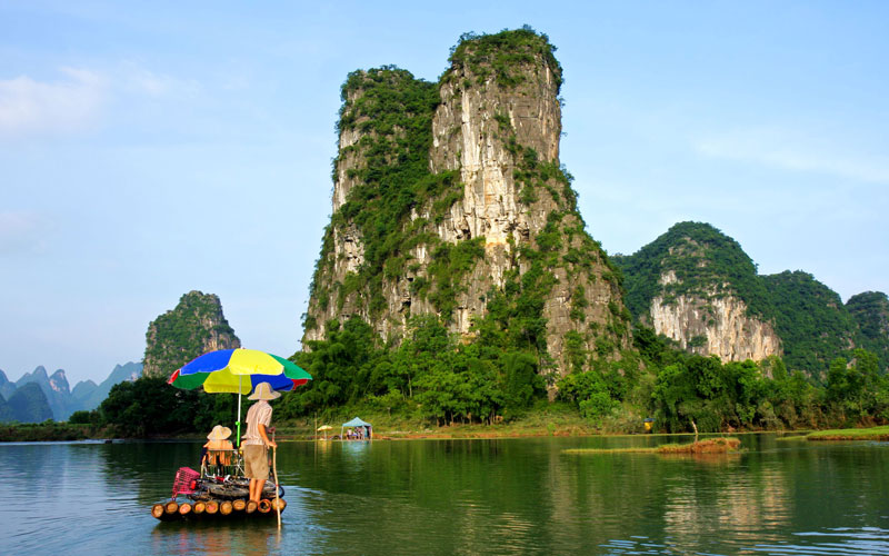 El rafting en el río Yulong es una actividad popular de los viajes a Yangshuo. Un paseo en balsa de bambú es una forma