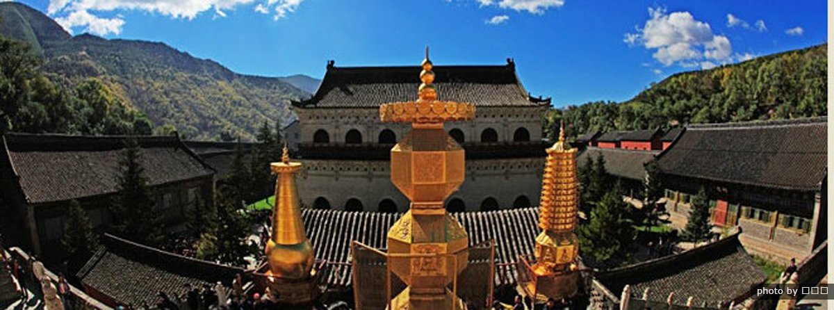El montaña Wutai tiene una abundancia de picos más pequeños - muchos de forma irregular - afloramientos de roca, acantilados y hermosas cuevas, lagunas de diversos tamaños, manantiales burbujeantes y arroyos alimentados por manantiales. Muchos templos en el Monte Wutai tienen una característica adicional, pagodas. Estos varían en el material desde la madera, al ladrillo, al hierro y a la piedra, incluyendo materiales más exóticos tales como vidrio esmaltado y vidrio de cristal.